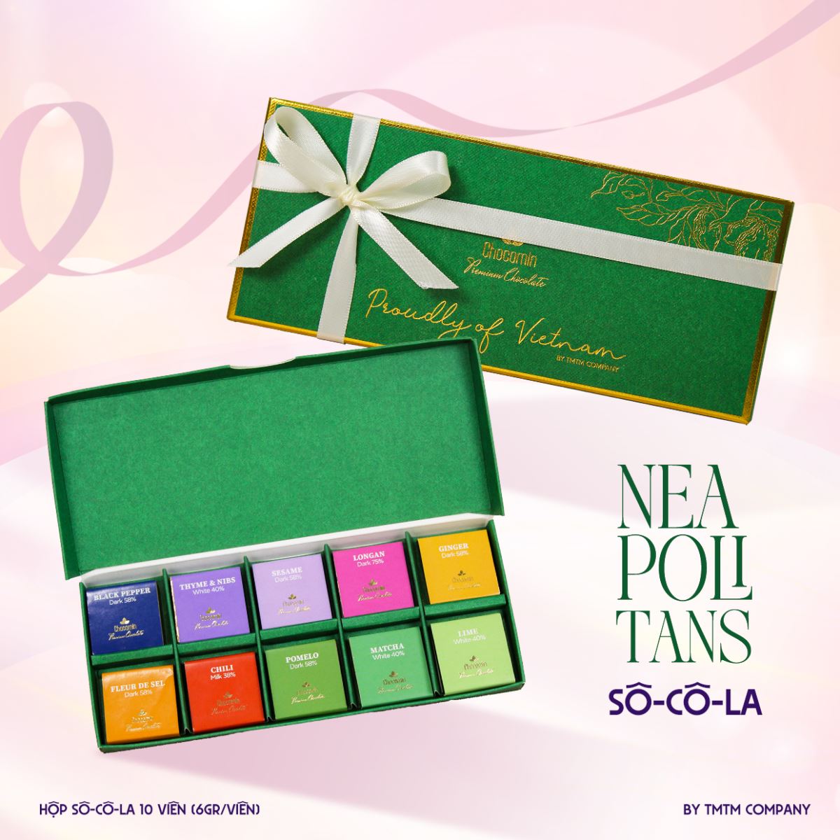 Với những viên socola ngọt ngào và có vị đắng nhẹ của ca cao nguyên chất, xen lẫn vị mặn nhẹ của muối biển, hay the cay của vị ớt, tươi mát của matcha, thơm nức của xoài, thoảng thoảng vị của cỏ hương thảo…. Và có hơn 20 vị để khách hàng có thể tự chọn và thưởng thức.